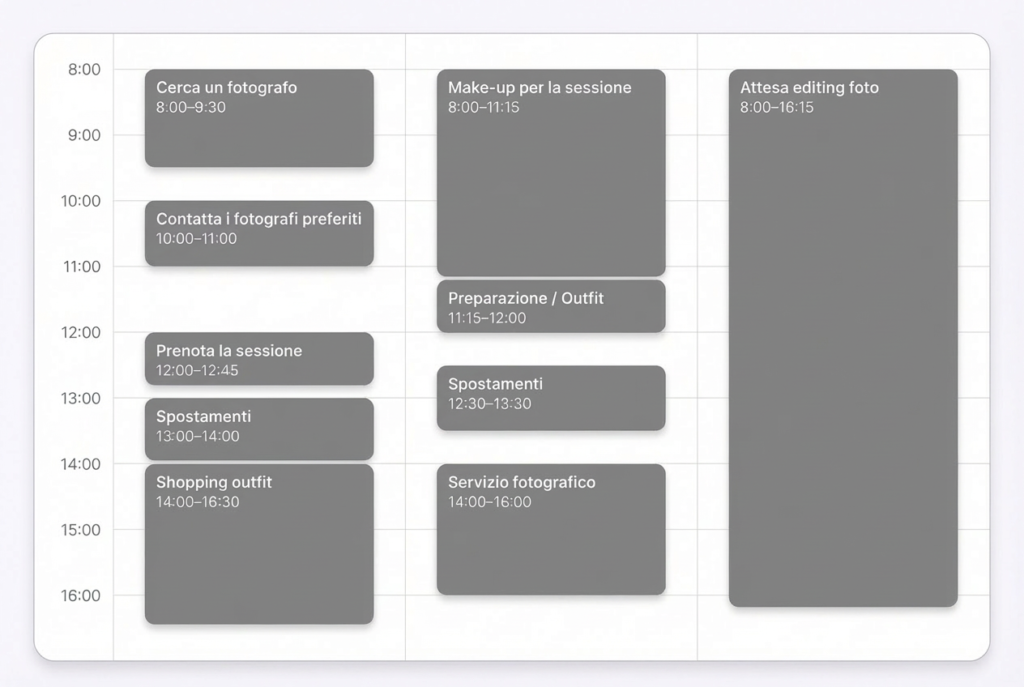 Bastano 6–10 foto. Noi curiamo stile, resa e revisione.